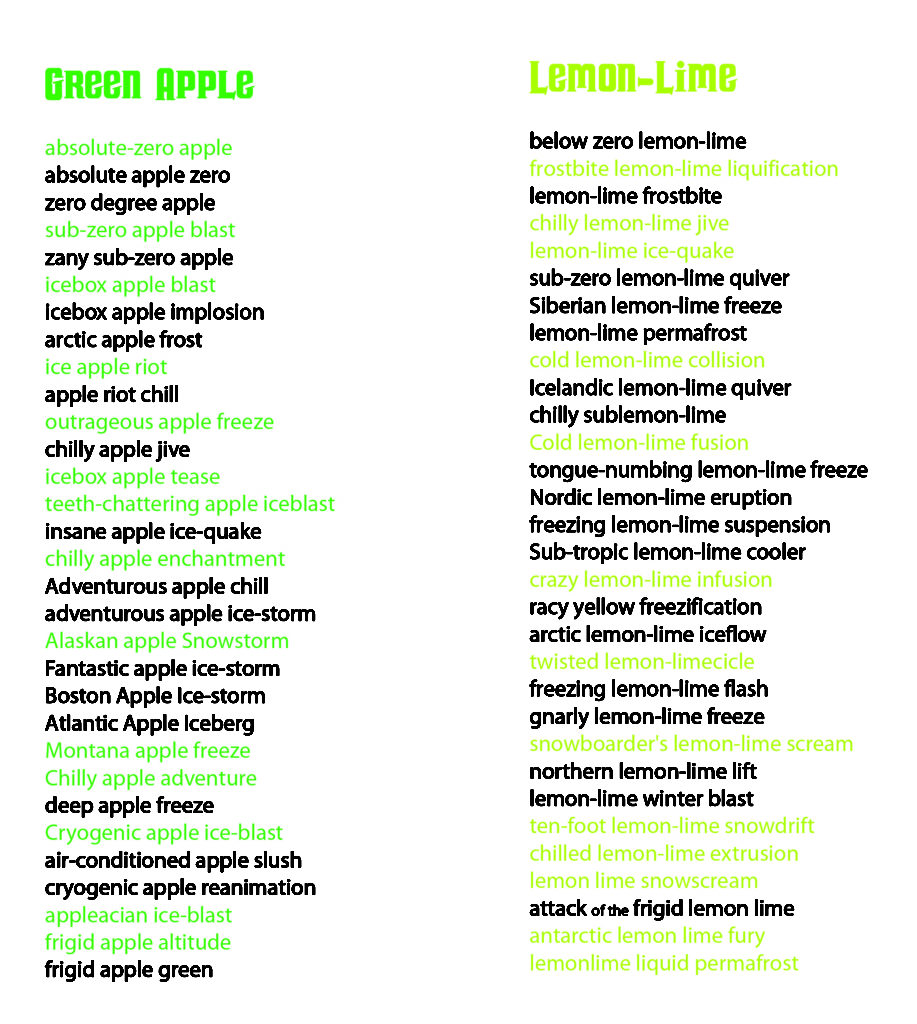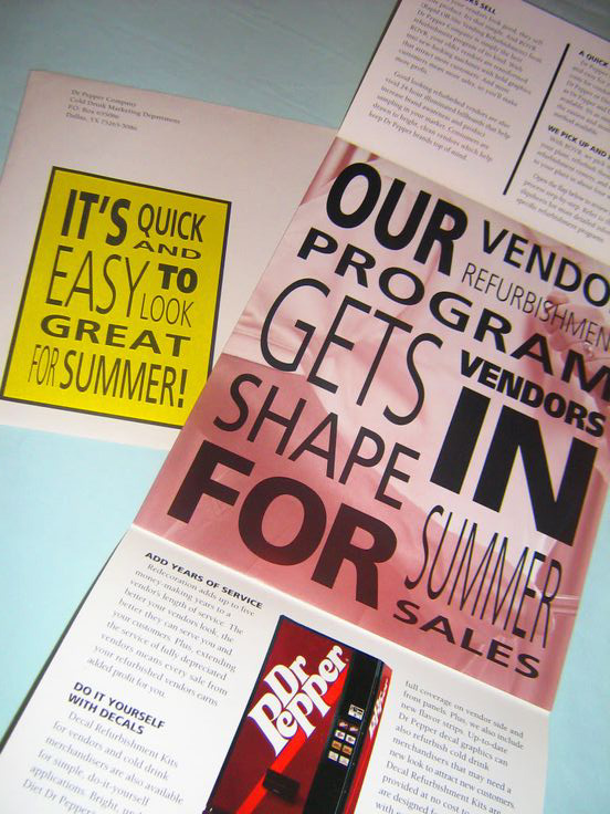 I worked as an Art Director and Copywriter on Dr Pepper, 7UP, Schweppes, Canada Dry, Sunkist, Hawaiian Punch, Slush Puppie, IBC Root Beer and Innovation Brands like Twinings Iced Tea producing POS; designing retailer and bottler communications, direct mail, and premiums; and writing consumer activations and promotions. My favorite retailer communication piece, an origami boat for 7UP, was so popular it was reprinted and mailed out a second time because of demand for it.